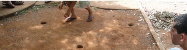 Faça quatros buracos na terra. Eles devem formar um “L” (três formam a linha maior do “L” e um marca, a linha menor. A distância entre os buracos deve ser de três palmos de criança). Combine a distância em que os jogadores devem ficar do “L” e aí o grupo sorteia o primeiro a jogar. O objetivo é encaixar as “jogadeiras” (essas costumam ser as bolas mais bonitas, escolhidas pelos jogadores para acertar o alvo) nos quatro buracos. Ganha quem primeiro fizer o trajeto de todos dos buracos, ou seja, passar por todo o “L”.